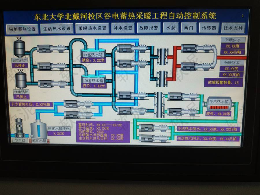 | 項(xiàng)目位于河北省秦皇島市北戴河區(qū)濱海大道54號(hào)。谷電價(jià)期間給兩個(gè)大水箱加熱,白天內(nèi)網(wǎng)循環(huán)給供暖系統(tǒng)和生活熱水系統(tǒng)。項(xiàng)目共計(jì)控制15臺(tái)變頻器、20個(gè)電動(dòng)閥門、15個(gè)溫度傳感器、5個(gè)壓力傳感器、4個(gè)液位傳感器,可根據(jù)預(yù)設(shè)方案自動(dòng)運(yùn)行。使用軟泥智能控制主機(jī)的4G聯(lián)網(wǎng)控制功能,管理人員通過手機(jī)即可遠(yuǎn)程查看設(shè)備運(yùn)行狀態(tài),設(shè)定自動(dòng)運(yùn)行的各項(xiàng)控制需求。 |