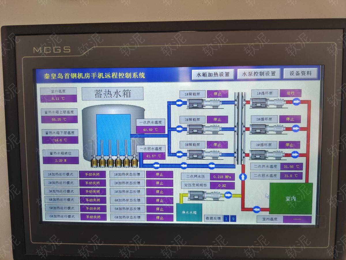 | 1. 冬季供暖系統(tǒng),夜間谷電價(jià)期間給大水箱蓄熱,二次網(wǎng)循環(huán)泵始終運(yùn)行,一次網(wǎng)循環(huán)泵通過間歇運(yùn)行,給板式換熱器升溫,維持二次網(wǎng)恒定溫度。白天不蓄熱,只釋放存儲的熱能,節(jié)約電費(fèi)。 2. 現(xiàn)場沒有人值班,通過手機(jī)軟件隨時(shí)可查傳感器數(shù)據(jù)。不限管理人員人數(shù),每人實(shí)名賬戶,自動保存操作記錄。 3. 設(shè)備可選擇自動模式,根據(jù)設(shè)定參數(shù)自動啟停。也可選擇手動模式,直接啟停每個(gè)設(shè)備用于調(diào)試檢修。 4. 在軟泥物聯(lián)網(wǎng)平臺選擇每周的工作日和休息日(每周只需設(shè)置一次),工作日會正常蓄熱,休息日維持低溫運(yùn)行防凍節(jié)能。 |